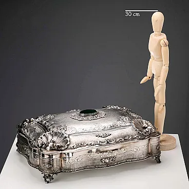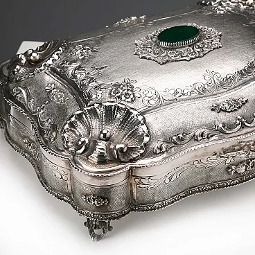 Scatola in argento finemente incisa, cesellata e lavorata a bulino. Corpo sagomato con angoli stondati; decori a motivi vegetali e fiori. Sui quattro angoli del coperchio conchiglie con perla. Sotto la base marchio dell'argento incusso; marchio dell'argentiere non decifrabile. Grammi 1705.