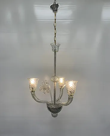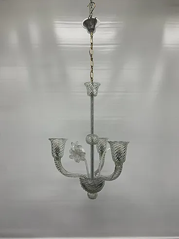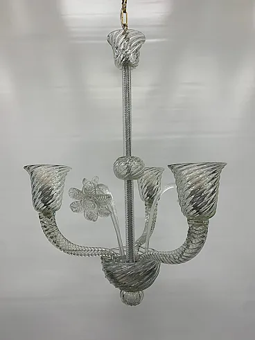 Fantastico lampadario italiano degli anni 1960 circa attribuito alla ditta Seguso V.A. È un lampadario a sospensione in vetro trasparente, elegante e armonioso, caratterizzato da una struttura slanciata e leggera che richiama la tradizione del vetro soffiato artigianale. La sospensione è affidata a una catena metallica con finitura dorata, collegata a un rosone semplice e discreto, da cui si sviluppa un fusto centrale sottile e lineare, arricchito da elementi decorativi in vetro lavorato con motivo a torsione che conferiscono movimento e raffinatezza all’insieme. Dal corpo centrale si diramano tre bracci curvati in modo simmetrico, anch’essi realizzati in vetro rigato e spiralato, che sostengono i portalampada a forma di coppa svasata, con una lavorazione a spirale ben definita che cattura e rifrange la luce in modo delicato. Al centro della composizione è presente un elemento decorativo floreale in vetro trasparente, finemente sagomato, che aggiunge un dettaglio ornamentale e bilancia visivamente la struttura. La parte inferiore si conclude con una sfera e un terminale pendente in vetro lavorato, che completano il disegno con eleganza e continuità stilistica. Nel complesso il lampadario appare sobrio ma ricercato, con un’estetica classica e luminosa, ideale per ambienti come sale da pranzo, ingressi o soggiorni, dove può offrire una luce diffusa e al tempo stesso valorizzare lo spazio con la sua trasparenza e la qualità della lavorazione artigianale.