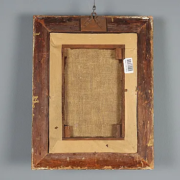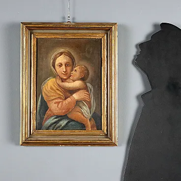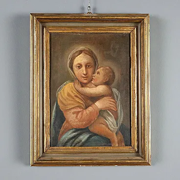 Olio su tela. Questa sacra maternità presenta Maria che guarda davanti a sè mentre il Bambino rivolge a lei lo sguardo, mettendole le braccine al collo: è la Madre quindi protagonista, colei che interloquisce con lo spettatore, al quale presenta il Figlio, però circondandolo con il braccio, a separarlo e proteggerlo dal mondo. La tela è stata in precedenza ritelata. L'opera è presentata in cornice in stile.