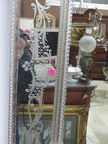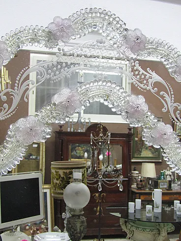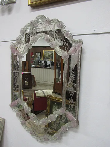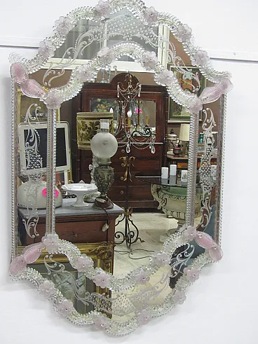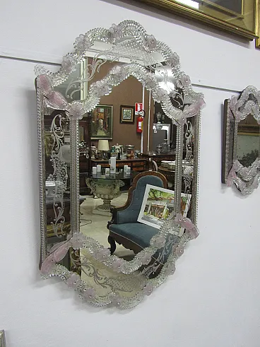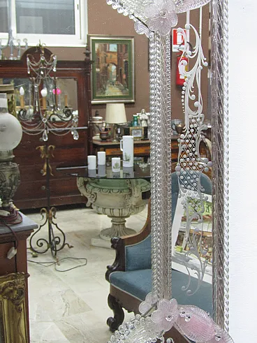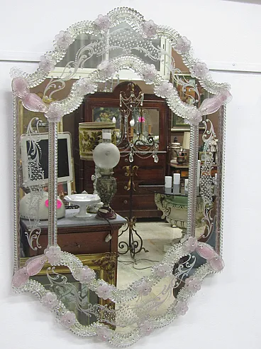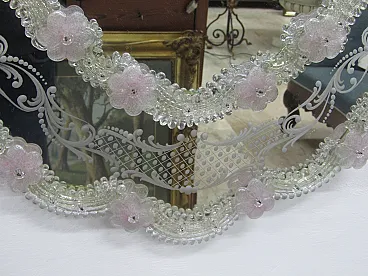 bellissimo e finemente decorato specchio in vetro di murano con fantasia rosa