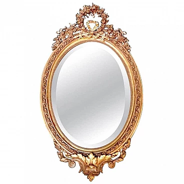 Cornice rococò con specchio prodotta in Francia (Napoleone III), la doratura delle ricche decorazioni floreali è a foglia d'oro, lo specchio è originale, è molato e realizzato con il metodo del nitrato d'argento, la cornice è stata eseguita con il procedimento chiamato pastiglia (gesso modellato). La lavorazione della pastiglia, frutto dell'antica tradizione artigiana, nasce in Italia alla fine del Quattrocento, rimane in uso per gran parte del Seicento, per poi proseguire nell'Ottocento. La pastiglia era costituita da una miscela di gesso (carbonato di calcio), resine legnose vegetali, miele, olio di lino e spesso polvere di marmo. Sul supporto di legno veniva incollato un velo di tela e successivamente venivano stesi vari stati di pastiglia, questa veniva poi impressa o incisa o modellata finemente, di solito i motivi decorativi erano in bassorilievo, poi si lasciava indurire il tutto e alla fine si applicava la doratura. L'oggetto è in perfette condizioni. Prodotto in Francia nel 1853.