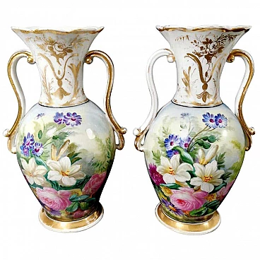 Coppia di vasi di porcellana (Porcelain de Paris) con bellissime decorazioni floreali, dipinti a mano e in foglia d'oro. I pezzi sono stati realizzati nel rispetto delle antiche tradizioni e della materia prima (caolino) dai maestri artigiani. I vasi sono contrassegnati da un marchio impresso (numero 367/10). Porcelain de Paris è un termine che si riferisce collettivamente ai vari laboratori e studi di decorazione della porcellana all'interno e nei dintorni di Parigi, in Francia. Non è il nome di una singola azienda o di un singolo produttore e di solito viene applicato a oggetti artigianali di ottima fattura prodotti tra la metà e la fine del XIX secolo. I produttori sono in alcuni casi sconosciuti e generalmente poco noti o hanno creato solo pochi e rari pezzi. Gli oggetti di porcellana antica di Parigi sono i più ricercati dai collezionisti e sono presenti in molti musei di tutto il mondo. Realizzati in Francia tra il 1854 e il 1860.