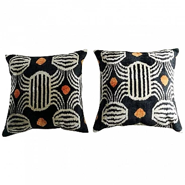 Cuscini (set da 2) realizzati a mano in velluto di seta Ikat e tessuto di seta Ikat, imbottitura in piuma. Design unico. Ikat è un procedimento per la tintura dei filati, diffuso tra i popoli malese e indonesiano. Il significato del termine è nuvola. Il procedimento consiste nel fissare i disegni decorativi mediante complesse operazioni di tintura del filato da intessere. L'anno di produzione è il 1990-1999, in Uzbekistan.