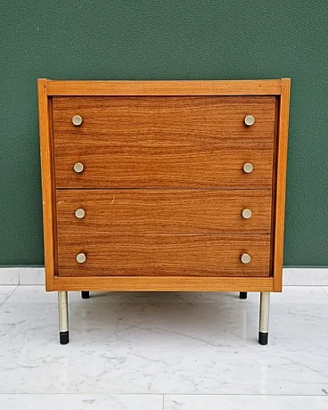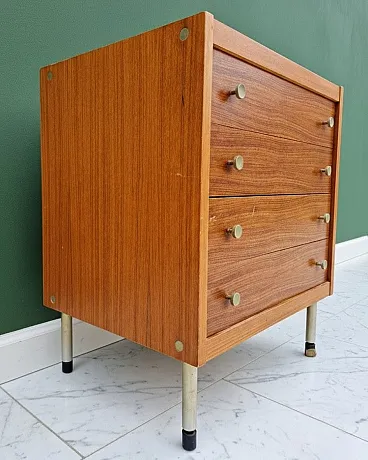 Materiali: La struttura è realizzata in un'essenza pregiata, in teak, con una splendida venatura a vista che conferisce calore e carattere. Le maniglie a bottone e i piedini affusolati sono in metallo cromato o alluminio, elementi distintivi del design dell'epoca.