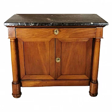 Graziosa e piccola credenza Empire in legno di ciliegio. Il piano superiore è in pregiato marmo nero, sotto il top troviamo un comodo cassetto, lo spazio funzionale sottostante è chiuso da due semplici ante, una delle quali, per l'utilizzo nel tempo, è leggermente deformata, e la chiusura non è perfetta (vedi foto). Le colonne ai lati sono solide e ben definite, le due rifiniture per le serrature sono in bronzo dorato e decorate con motivi floreali, il meccanismo delle serrature è stato sostituito nel tempo. Lo stile è un sobrio tardo impero del 1850, infatti dopo la morte di Napoleone (1814), nel periodo post-Ristorazione il ricco stile imperiale è diventato più lineare, delicato e contenuto nelle dimensioni dei mobili. Questa piccola credenza è un esempio caratteristico. Prodotta in Francia nel 1850.