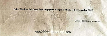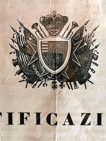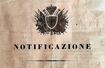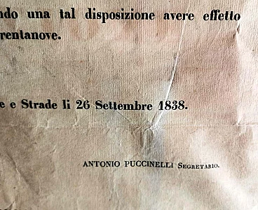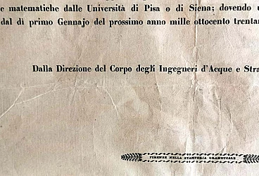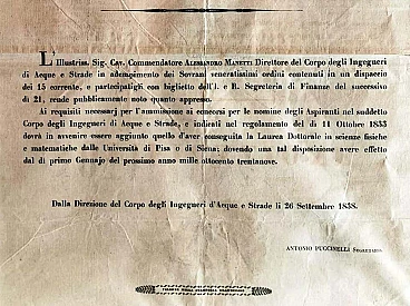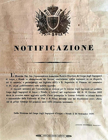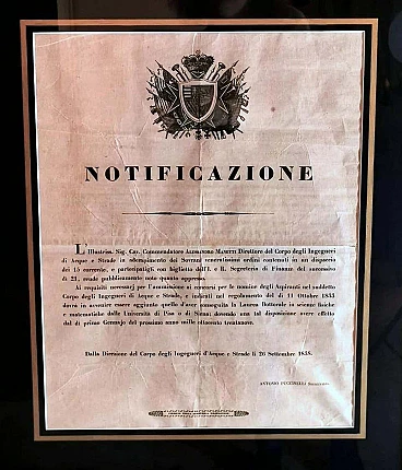 Antico e originale documento del Granducato di Toscana incorniciato, in tempi recenti, da un abile maestro artigiano fiorentino che ha utilizzato una cornice in legno pregiato e dipinta in oro. La Notificazione era un avviso pubblico emesso dall'autorità per portare all'attenzione della popolazione o delle istituzioni o delle persone interessate una situazione legislativa, un atto amministrativo o una dichiarazione d'intenti dell'autorità stessa. Nel 1838 (anno del presente documento) l'Italia (ancora divisa in Regni, Stati, Ducati) fu pervasa da una certa forma di riformismo. I diversi duchi, principi, ecc. ostentano il modernismo, vari programmi cominciano a sviluppare l'economia, a rendere efficiente l'amministrazione, a cambiare alcune leggi, a intervenire sul territorio con infrastrutture, come strade, canali, ferrovie. Per questo motivo sono state richieste maggiori professionalità, esperienza e preparazione tecnica a tutti gli operatori che hanno dovuto contribuire a questo cambiamento. Nel Granducato di Toscana regnò dal 1824 il Granduca Leopoldo II d'Asburgo-Lorena, il cui governo si segnalò subito per un'intensa politica di opere pubbliche, bonifiche, ampliamento dei porti, costruzione di ferrovie, tanto che la Toscana rappresentò un'isola di libertà e di progresso tra gli altri Stati italiani. Questo documento è una valida e importante testimonianza di questa ondata di modernismo. Nella Notificazione, l'Ing. Alessandro Manetti, Direttore dello Stato Maggiore delle Acque e del Genio della Strada, per adempiere agli ordini del Granduca richiede, oltre ai requisiti necessari per l'ammissione ai concorsi del suddetto Corpo, il Diploma di Laurea in Scienze Fisiche e Matematiche da conseguire presso l'Università di Pisa o di Siena (le due più prestigiose università toscane dell'epoca). Il documento fu stampato a Firenze nella Stamperia Granducale il 26 settembre 1838 e reca lo stemma del Granducato di Toscana.