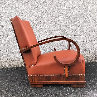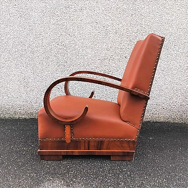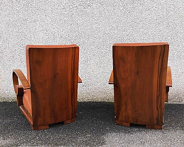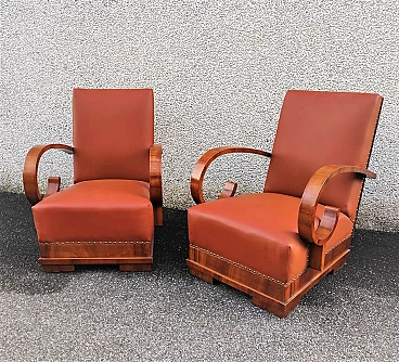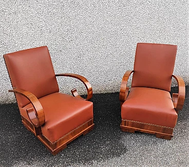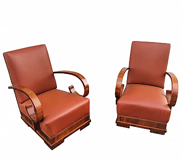 Coppia di poltrone Art Déco in legno di noce e pelle, anni '30