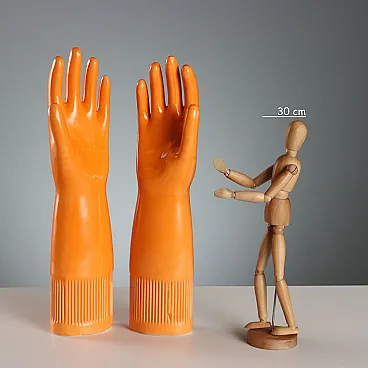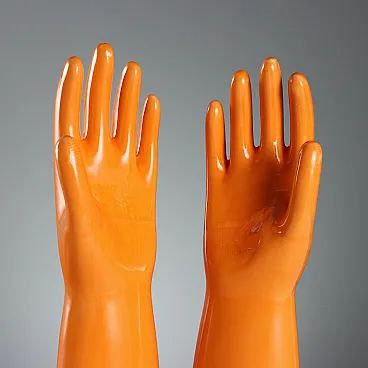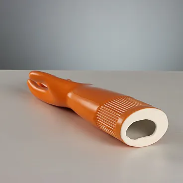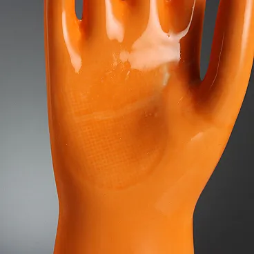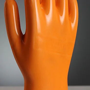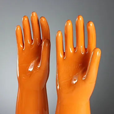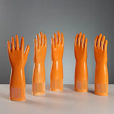 Gruppo di cinque stampi in porcellana color arancio per guanti Pirelli. La Pirelli realizzava i guanti in lattice grazie a delle matrici in porcellana prodotte in un'azienda italiana di Lungavilla. La produzione è andata avanti fino a che la Pirelli non ha deciso di spostare la catena in Malesia. Il marchio "E P" "Elettro porcellana" si riferisce ad aziende che producono componenti elettrici isolanti in porcellana, come FPL (Fabbrica Porcellane Lungavilla).