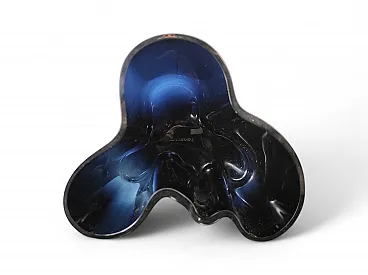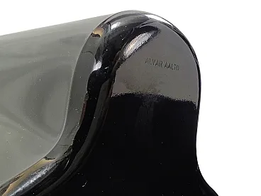 Questo è un iconico vaso Aalto (noto anche come vaso Savoy), capolavoro del design finlandese creato da Alvar Aalto per il marchio Iittala. L'oggetto si distingue per la sua celebre forma organica e asimmetrica che richiama il profilo dei laghi finlandesi, realizzata in vetro soffiato a bocca in una raffinata tonalità blu cobalto molto scuro, quasi nero. Sulla base è presente l'incisione d'archivio del designer e sul bordo esterno si nota l'adesivo originale rosso del produttore che ne certifica la provenienza.
