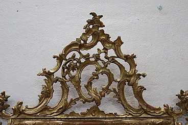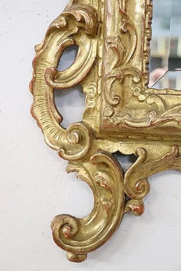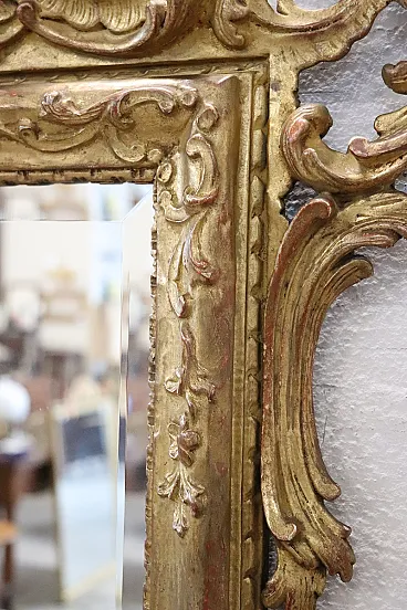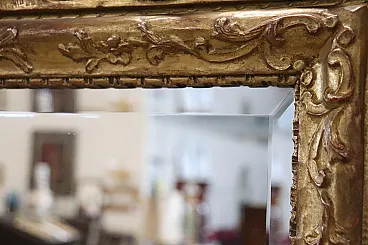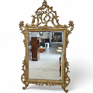 Presenta una elaborata decorazione con volute, elementi vegetali (motivi rocaille) e piccoli fiori. La parte superiore è riccamente traforata con numerose volute fogliacee che si estendono lungo i lati e la base della cornice. Questo elegante specchio è perfetto per chi cerca un pezzo distintivo nella propria stanza. La sua ricca decorazione è armoniosa ed estremamente raffinata senza risultare impegnativa.