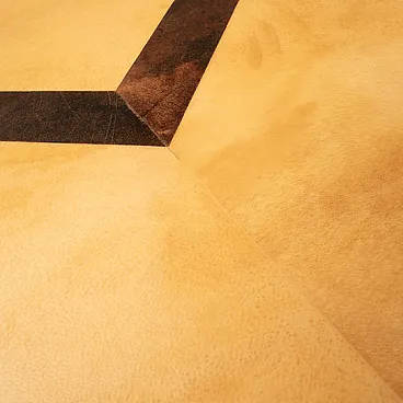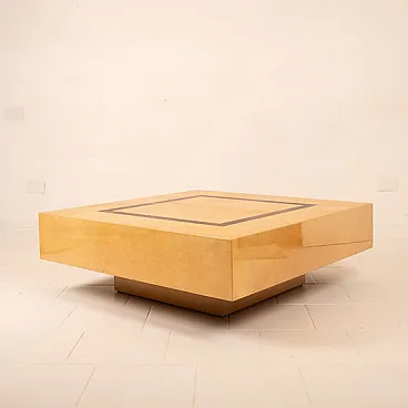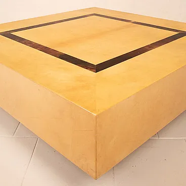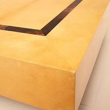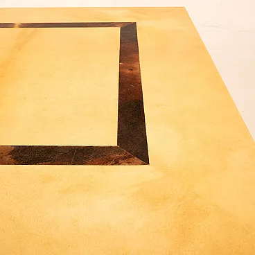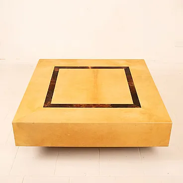 Tavolino basso disegnato da Nucci Valsecchi per Aldo Tura negli anni '70, mod: 3000D dell'Archivio Tura, realizzato in pergamena, o pelle di capra, tinta a mano in due tonalità distinte: una finitura chiara, calda e luminosa per la superficie principale e una pergamena più scura, quasi bruciata, per il dettaglio geometrico centrale incassato.