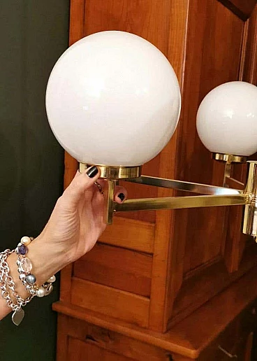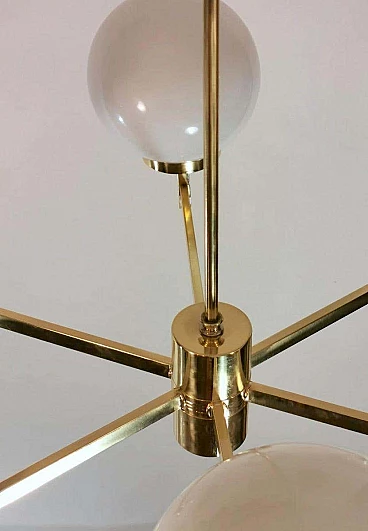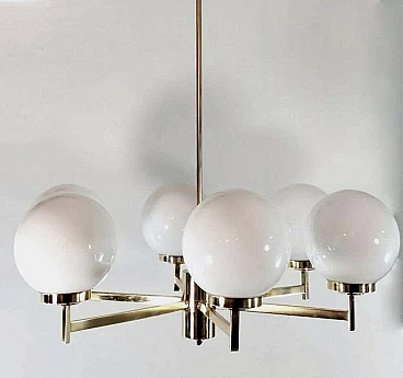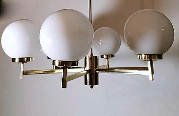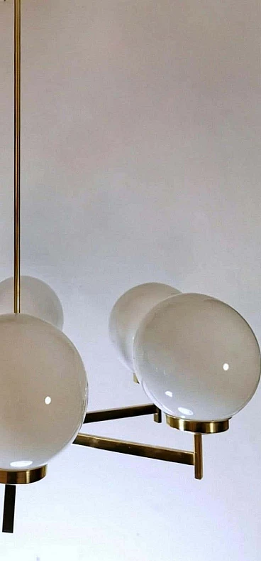 Lampadario Stilnovo in ottone e vetro opalino, anni '60