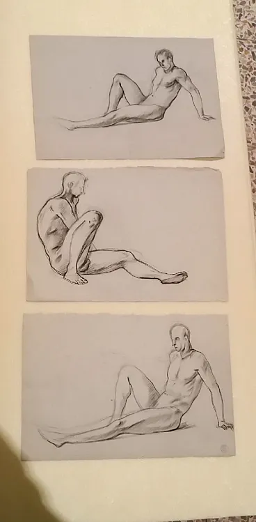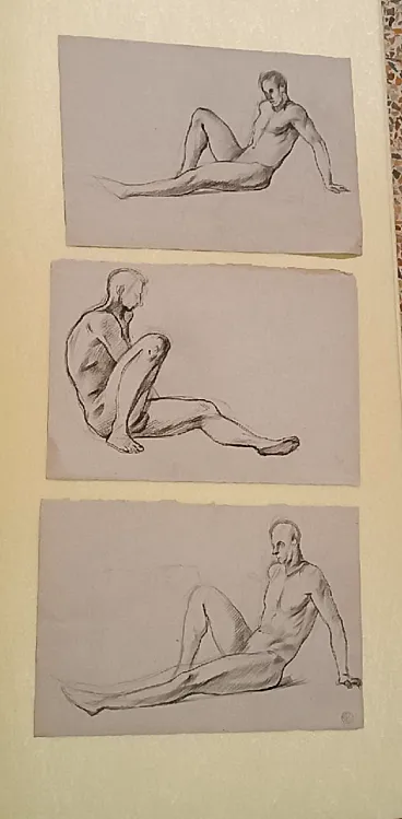 3 Nudi maschili, disegni a matita su carta, '900 9