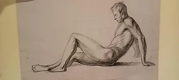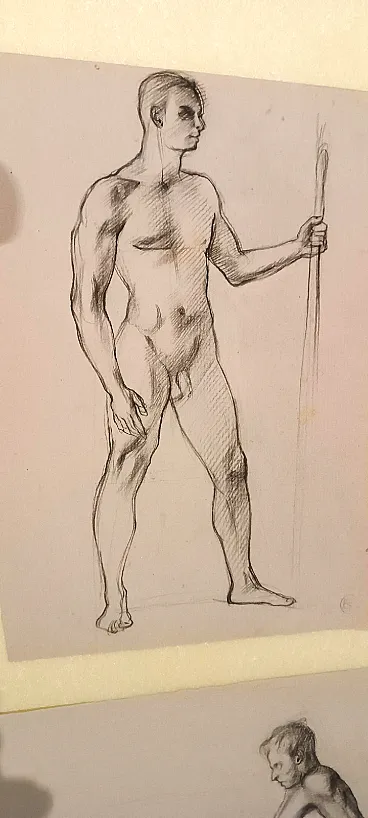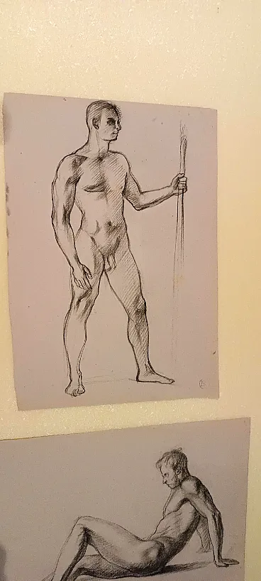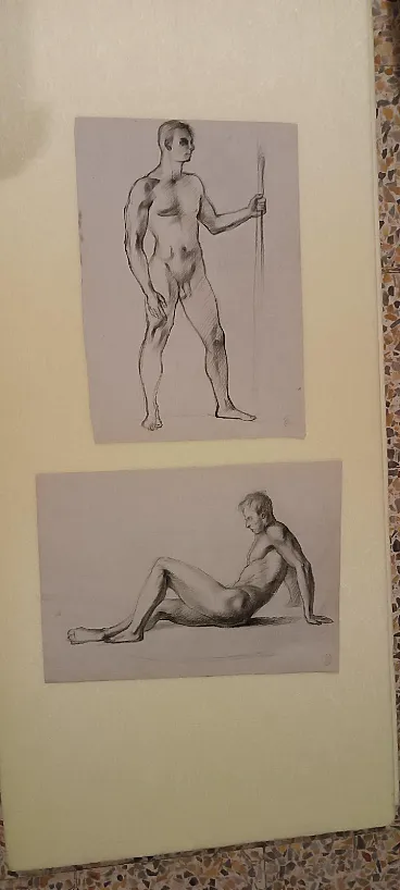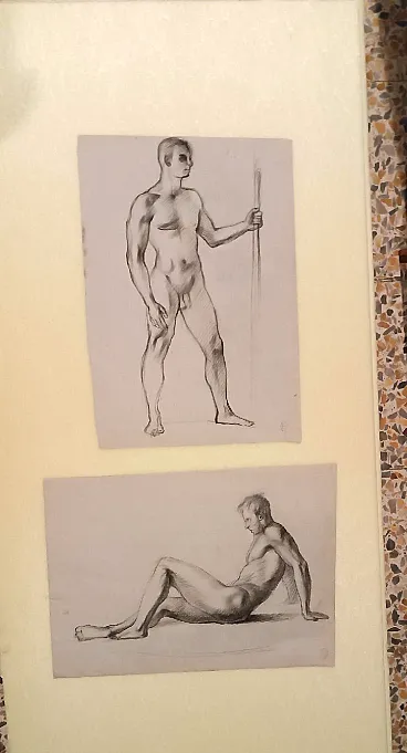Coppia di nudi maschili, disegni a matita su carta, '900