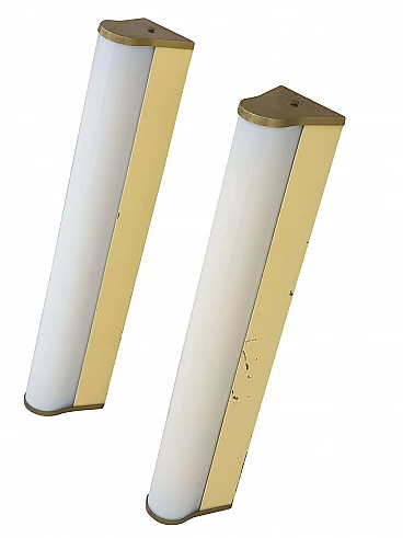 Coppia di lampade da parete di La Fluorescente Milano, anni '50. Metallo laccato, vetro opalino, plastica, ottone. Lampadine al neon. Funzionanti.