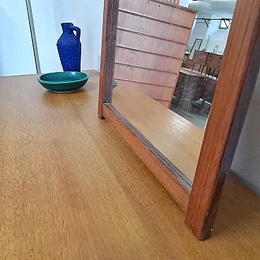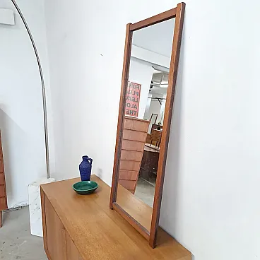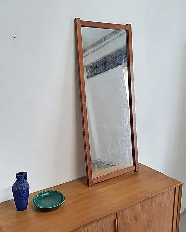 Questo specchio da parete o da appoggio rappresenta un esempio essenziale del design scandinavo degli anni '60, caratterizzato da una cornice in teak con proporzioni verticali slanciate e dettagli costruttivi che testimoniano l'attenzione artigianale. La struttura presenta montanti laterali che si sviluppano verticalmente con traversa superiore e inferiore, creando un telaio che inquadra la superficie speculare.