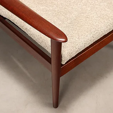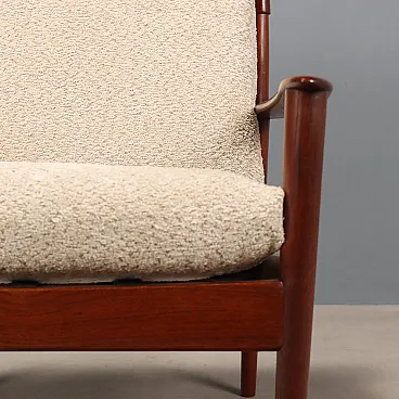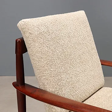 Poltrona vintage con struttura a vista in legno di teak, cuscini appena rinnovati con tessuto bouclé beige che poggiano su cinghie in gomma, anch'esse rinnovate.