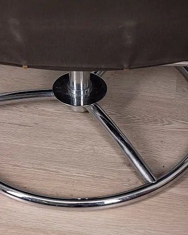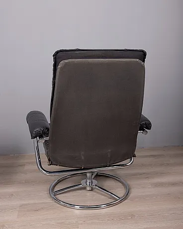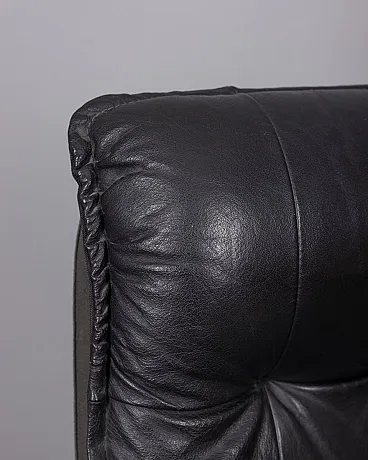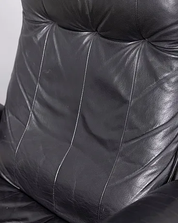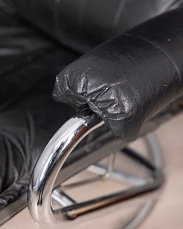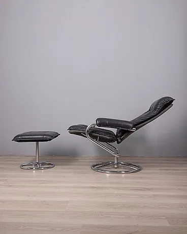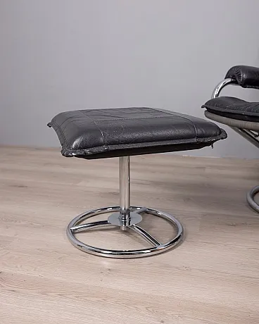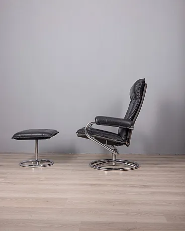 Poltrona in pelle nera con poggiapiedi, anni '70