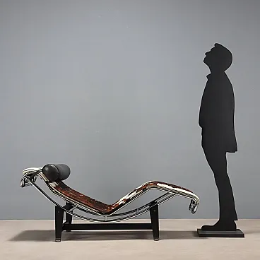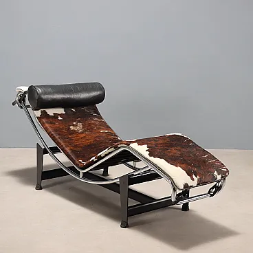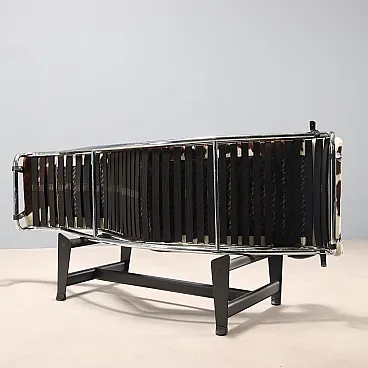 Elegante chaise longue in metallo smaltato e cromato, presenta un materassino in espanso con rivestimento in cavallino e un cuscino in pelle.