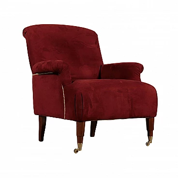 Poltrona con imbottitura in espanso e rivestimento in tessuto (non originale del periodo), gambe in legno con rotelle anteriori (non originali del periodo). Prodotto in buone condizioni, presenta piccoli segni di usura. Altezza seduta: 49 cm.