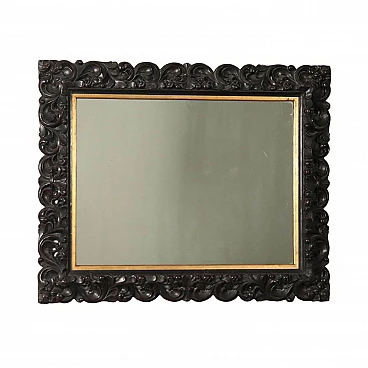 Specchiera in stile neobarocco. La cornice è intagliata con volute fogliacee, interamente laccata a finta patina. Prodotto in discrete condizioni che mostra alcuni segni di usura.