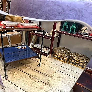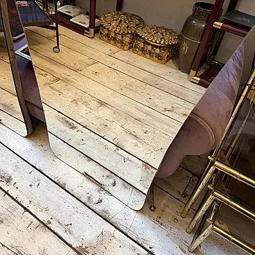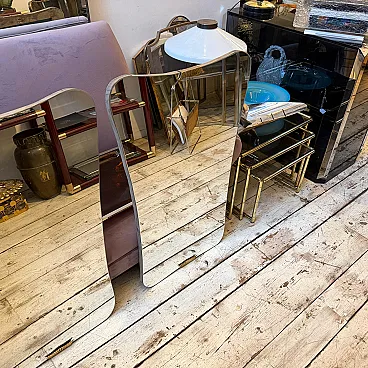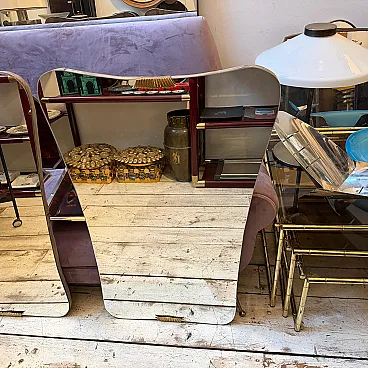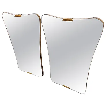 Una splendida coppia di grandi specchi da parete in stile Gio Ponti, molto ricercati, risalenti agli anni Cinquanta. Questi specchi catturano perfettamente l'eleganza fluida e sofisticata caratteristica del design italiano del dopoguerra, con la loro forma raffinata e la combinazione di materiali di lusso. Ogni pezzo è caratterizzato da una superficie in vetro specchiato inserita in una cornice elegante che integra magnificamente il legno caldo e gli accenti in ottone lucido, luminosi e di spicco, che delimitano il vetro. Il legno, probabilmente ebanizzato o scuro, crea un bel contrasto con l'ottone, aggiungendo profondità e ricchezza al design. La forma complessiva suggerisce le caratteristiche forme sottilmente curve o asimmetriche che caratterizzavano il celebre lavoro di Gio Ponti, conferendo agli specchi una presenza scultorea e artistica. Presentati in coppia, offrono una versatilità eccezionale per creare un punto focale coordinato e drammatico in un corridoio, sopra una consolle o a fianco di un elemento architettonico. L'ottone probabilmente mostra una bella patina vintage, che testimonia la sua autentica origine italiana di metà secolo. Questi specchi sono una rappresentazione iconica e senza tempo del modernismo italiano di alta qualità e sapranno elevare qualsiasi interno contemporaneo o di ispirazione vintage. Nel complesso sono in ottime condizioni.