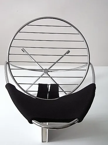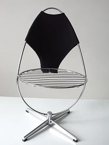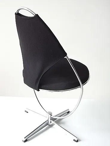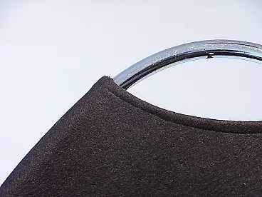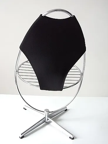 Questa sedia girevole vintage è conosciuta come Calimero. Presenta due ovali cromati che formano il sedile e lo schienale con rivestimento in feltro grigio scuro/blu, il tutto poggiato su una base girevole. La sedia rimane in buone condizioni vintage con alcune macchie nere sulla base.