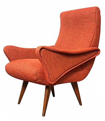 Poltrona anni 50, attribuita a Nino Zoncada. La poltrona è di manifattura Italiana, completamente restaurata, interni nuovi, rivestimento in cotone Bouclè di colore Arancio. La struttura è completamente in legno perfettamente stabile, piedi in Faggio con forma conica, tipico design degli Anni 50. Altezza seduta cm 45.