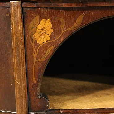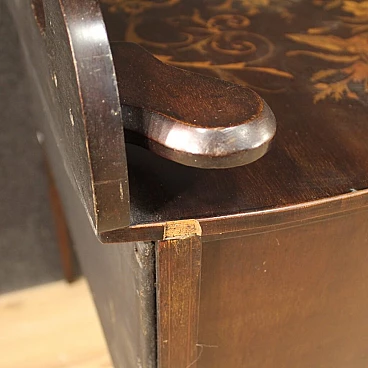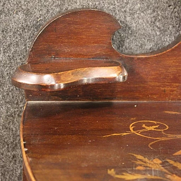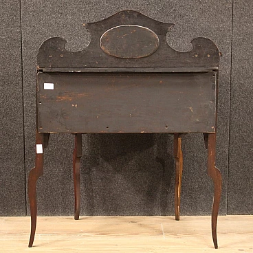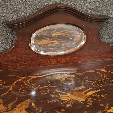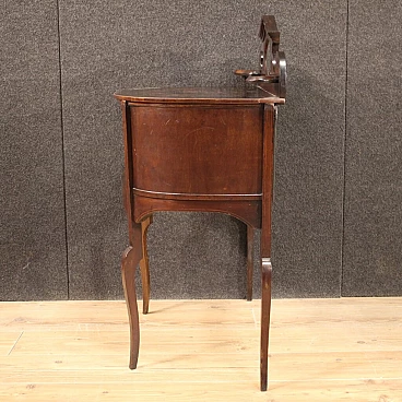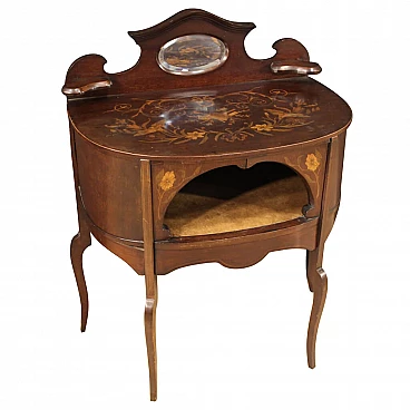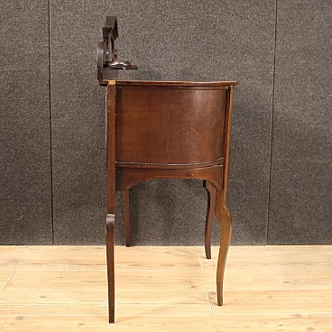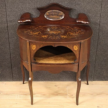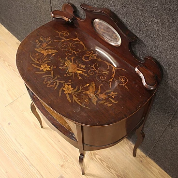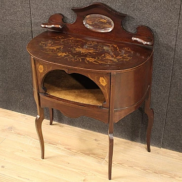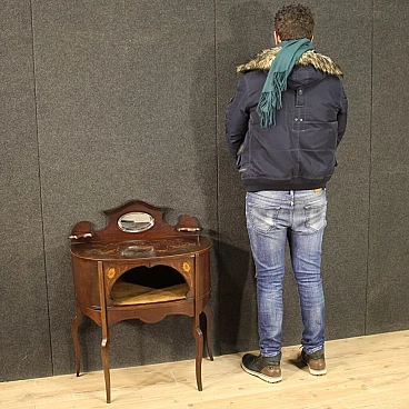 Piccola toilette inglese della prima metà del XX secolo. Mobile scolpito e intarsiato in legni di mogano, acero e legni da frutto di bella linea e piacevole arredamento. Toilette adornata da intarsi floreali su fronte e piano d'appoggio (vedi foto). Piano che presenta numerosi graffi e segni di usura (vedi foto). Mobile completo di ampio vano a giorno frontale rivestito in tessuto con diversi segni di usura e strappi, da sostituire. Mobiletto munito di alzatina con due piccoli piani laterali e specchio centrale (vedi foto). Toilette ideale da inserire in una camera i salotto, per antiquari e arredatori. Strutturalmente sana, presenta diversi segni del tempo, da restaurare.