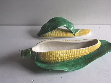 Zuppiera in pannocchia in maiolica di Sarreguemines in giallo e verde, anni '50