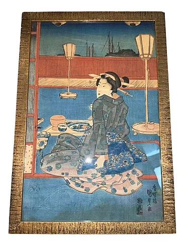 Artista: Utagawa Kunisada (1786-1865) Tecnica: Xilografia policroma (ukiyo-e), inchiostro e colore su carta washi Datazione: XIX secolo (periodo Edo) Originalità: Xilografia tradizionale giapponese con sigilli dell'artista Dimensioni (con cornice): 40 × 27 cm Cornice: Cornice d'epoca; smaltato. Descrizione L'opera raffigura una donna elegante seduta in un interno tradizionale giapponese. La figura è resa nello stile caratteristico di Kunisada: un ritratto femminile idealizzato con un'acconciatura raffinata e un kimono riccamente decorato. La tavolozza dei colori combina blu profondi, toni rosa tenui e intricati dettagli tessili, riflettendo l'estetica matura dell'artista. La composizione incorpora elementi della vita quotidiana del periodo Edo - tavoli bassi, ceramiche e architettura domestica - creando una scena intima e suggestiva. La stampa include la firma di Kunisada e due sigilli, in linea con la sua pratica di firma consolidata. Condizioni La stampa xilografica presenta la naturale patina dovuta al tempo, tipica delle opere d'arte vecchie di oltre un secolo. I colori sono ben conservati, anche se leggermente attenuati dal tempo. La carta presenta leggere pieghe e segni superficiali localizzati, tipici delle stampe storiche ukiyo-e. La cornice è vecchia e non è stata aperta dal retro; l'opera è stata conservata dietro vetro. Provenienza Da una collezione privata austriaca. La storia dettagliata della proprietà è sconosciuta, ma l'assemblaggio e i materiali sono coerenti con la conservazione storica a lungo termine. Note Utagawa Kunisada è considerato uno dei maestri più prolifici e influenti della scuola Utagawa. Questa stampa rappresenta il genere bijin-ga (ritratti di belle donne), un soggetto per il quale Kunisada era molto apprezzato. La cornice d'epoca aggiunge interesse decorativo e storico.