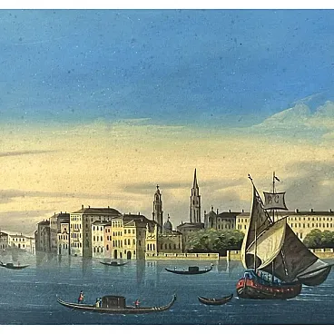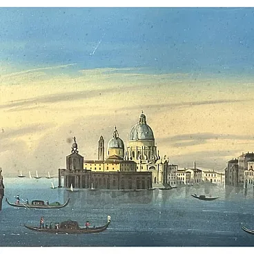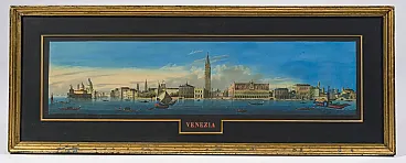Il dipinto si dispiega in un formato marcatamente orizzontale — quasi una striscia panoramica — e abbraccia l’intera veduta del Bacino di San Marco vista dall’acqua, secondo la prospettiva classica del vedutismo veneziano. A sinistra, la punta della Dogana e la cupola di Santa Maria della Salute dominano il profilo lagunare; al centro si innalza il Campanile di San Marco, affiancato dalle Procuratie, dal Palazzo Ducale con le sue arcate gotiche e dalla Zecca; verso destra la scena si apre su ulteriori edifici del fronte del Molo, fino a dissolversi nel bacino.