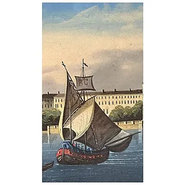 Il primo piano è animato dall’andirivieni delle imbarcazioni tipicamente veneziane: gondole dai profili neri e agili scivolano sull’acqua scura, mentre al centro-destra una feluca a vela latina — la cui randa reca dipinto in bella evidenza il monogramma GB, firma discreta ma inequivocabile dell’autore — occupa la scena con il suo carico di colore e movimento. Sullo sfondo, a sinistra, si intravede l’Isola di San Giorgio e la laguna aperta.