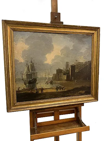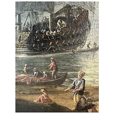 La composizione si apre su un’ampia veduta portuale di sapore mediterraneo, dominata a sinistra da un imponente veliero a tre alberi con vele spiegate, che reca in cima all’albero maestro la bandiera olandese. Il bastimento, ritratto di tre quarti, è circondato da imbarcazioni minori: una lancia affollata di marinai si stacca dalla sua fiancata verso la riva, mentre una feluca a vela latina con vele rosse ondeggia più a destra, ancorata in prossimità della spiaggia.