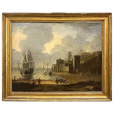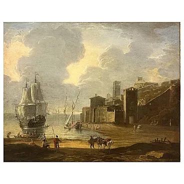 Il primo piano è animato da un gruppo di figure in costumi variopinti — un marinaio in rosso e nero, un levantino con mulo carico, donne sedute sulle rocce — che conferiscono alla scena quella vivacità aneddotica cara alla tradizione delle bambocciate nordiche trapiantate nel paesaggio del Sud. Sullo sfondo a destra si erge un borgo costiero con torre merlata e bastioni in pietra scura, coronato da un colle su cui svettano ulteriori costruzioni: un paesaggio urbano che evoca le coste della Liguria, della Provenza o del Levante spagnolo, risolte però in chiave di capriccio pittoresco più che di veduta fedele.