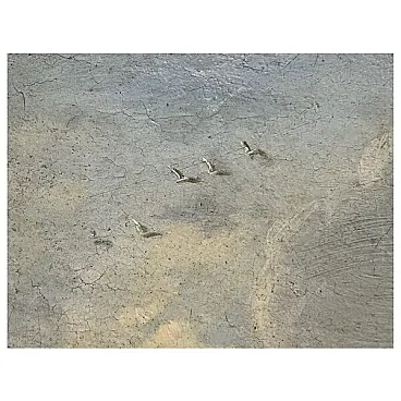 Il cielo occupa quasi metà della superficie pittorica e rivela la mano di un pittore abile nel trattamento atmosferico: masse di nuvole biancastre si addensano verso il centro, lasciano filtrare un bagliore dorato che illumina l’acqua con riflessi cangianti, e si dissolvono verso sinistra in un cielo più aperto. La luce, radente e teatrale, unifica la scena conferendole un respiro quasi scenografico.