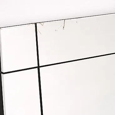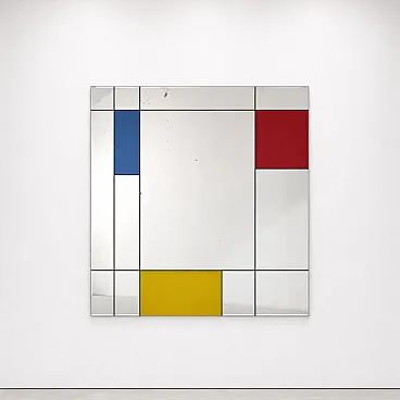 Importante specchio da parete quadrato postmoderno italiano degli anni 80, realizzato in stile Piet Mondrian e attribuito a Rimadesio. Il disegno è costruito come una composizione geometrica rigorosa, in cui la superficie specchiante viene suddivisa da sottili linee nere che definiscono campi rettangolari e quadrati, alcuni dei quali evidenziati da vivaci inserti nei colori primari: rosso, blu e giallo.