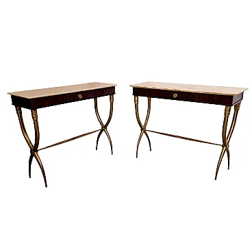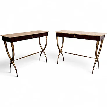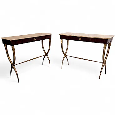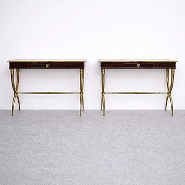 Raffinata coppia di console disegnate da Paolo Buffa, espressione dell’eleganza colta e misurata che contraddistingue il design italiano del dopoguerra. Questi arredi uniscono materiali nobili e proporzioni leggere in una composizione di grande equilibrio decorativo.