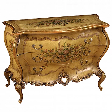Comò veneziano della metà del XX secolo. Mobile di favolosa linea e grande qualità in legno laccato, dorato e dipinto a mano con decori floreali di grande piacevolezza. Cassettone da camera o salotto, per antiquari e arredatori, munito di tre cassetti frontali di buona capacità. Piano superiore ligneo in carattere, anch'esso laccato e dipinto, con qualche segno di usura. Mobile sorretto da quattro piedi mossi con decoro a ricciolo e grembiule finemente scolpito sul fronte del cassetto inferiore e sui fianchi (vedi foto). Comó di grande arredamento che presenta alcuni segni del tempo. Strutturalmente sano, nel complesso in buono stato conservativo.