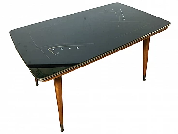 Tavolino Anni 50 di manifattura Tedesca realizzato negli anni 50, struttura in legno di Faggio con puntali in Ottone, piano in vetro molato con inserti in Madreperla, ripiani laterali estensibili, effettuato restauro conservativo. Sul piano in vetro sono presenti alcuni graffi causati dal tempo. Larghezza cm 109-Profondità cm 64-Altezza minima cm 60-Max cm 67