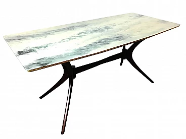 Tavolo attribuito a Ico & Luisa Parisi. Struttura restaurata in legno di Ciliegio ebanizzato, piano in legno, ripiano in vetro molato con sfumature in gradazione di colore Verde. E' presente una lieve mancanza nel sotto vetro (vedi foto).