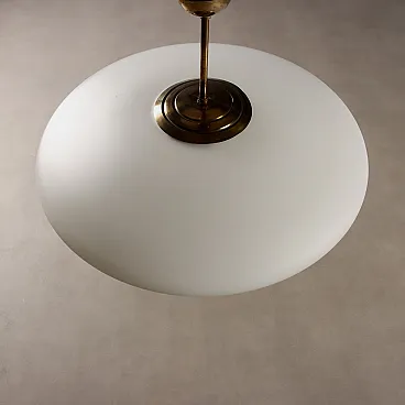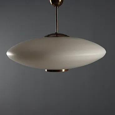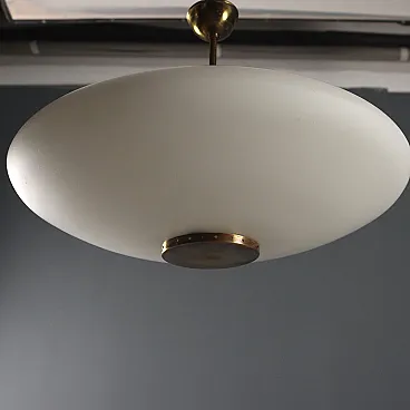 Lampada da soffitto vintage con struttura in ottone e diffusore in vetro opalino a forma di ufo.