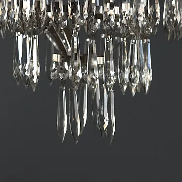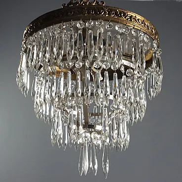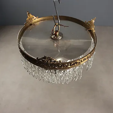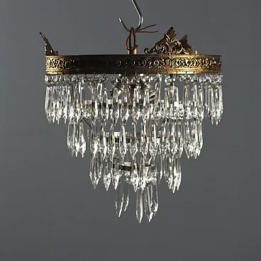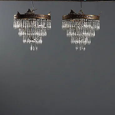 Coppia di lampadari in stile Impero. Metallo dorato lavorato a foglie susseguenti con pendenti in vetro trasparente di cui alcuni mancanti. Tre luci centrali. Italia, inizio XX Secolo.