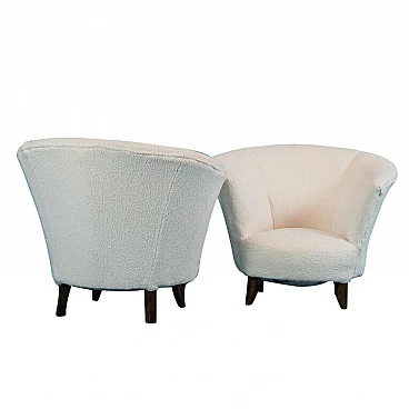 Coppia di poltrone a pozzetto, produzione anni ’50. Le poltrone sono state completamente restaurate e tappezzate con un tessuto Boucle di color bianco, da notare anche il bordino in boucle. Struttura della poltrona in legno. I due piedi anteriori sono conici smussati mentre i due posteriori sono a forma rettangolare. Anche essi in legno. Ottime condizioni generali, pari al nuovo.