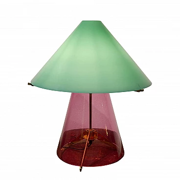 Chiamato da Gae Aulenti, Umberto Riva disegna una lampada da tavolo preziosa, composta da un diffusore conico a strati di vetro opalino, sorretto da una base in vetro trasparente che cela la struttura in metallo e ottone. Un oggetto di natura fortemente decorativa, prodotto con tecniche produttive tradizionali come la soffiatura del vetro, tipiche del sapere fare artigianale La lampada è in ottime condizioni e perfettamente funzionante.