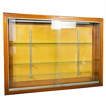 Vetrina a parete da ottico, utilizzata come espositore. Struttura in legno, presenta due ante scorrevoli a scomparsa in vetro. All'interno ci sono 3 mensole in cristallo, sostenute da una struttura di metallo. Sulla parte superiore è presente un neon per illuminare la vetrina. Buone condizioni generali, con piccoli segni del tempo, visibili in foto.