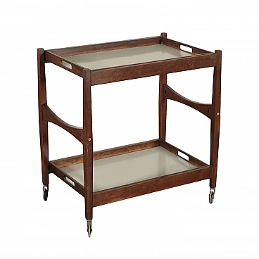 Carrello di servizio con doppio piano vassoio asportabile. In legno di faggio tinto e laminato. Prodotto in buone condizioni, presenta piccoli segni di usura.