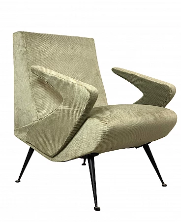 Poltrona anni 60 di manifattura Italiana, struttura in legno con rivestimento in Velluto Jaquard pied de poule di colore Lt.Green, piedi in Metallo a forma conica con il tipico design degli anni 60. Il design e la linea strutturale asimmetrica è decisamente futuristica per i canoni degli anni 60. Completamente restaurata, altezza seduta cm 42.