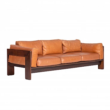 Divano 3 posti Bastiano di Tobia Scarpa per Gavina, 1960. Struttura portante in palissandro. Cuscini volanti con fondo in poliuretano e parte superiore in piuma su tiranti elastici di acciaio ricoperto. Il rivestimento in pelle originale presenta leggerissimi segni.