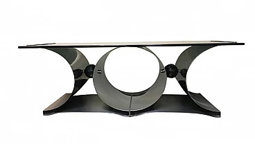 Tavolino in acciaio e vetro disegnato negli anni '70 da Francois Monnet. Di forma rettangolare, il piano in vetro fume' con bordi smussati poggia su una splendida base in acciaio curvato, la cui lavorazione alterna superfici lucide e spazzolate con un interessante gioco di forme. Globi di raccordo laccati neri completano l'esteticaforme arcuate, dall’alto dà l’idea di un fiore. La tipica struttura del designer che sfrutta inserti metallici di raccordo a vite e interti metallici di giuntura tra le varie lastre d’acciaio consente un facile smontaggio/montaggio. Si presenta in eccellenti condizioni con trascurabili segni di ossidazione od usura